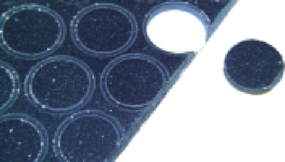 Aus hochelastischem Elastomer, vorgestanzt auf Rollenware; Farbe: schwarz. Abmessungen: D 10, H 3,2 mm.