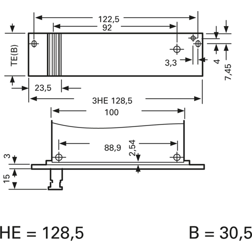 Technische Merkmale (Typenbezeichnung, Höhe in HE und mm (H), Breite in TE und mm (B)): 34 405 376 00, 3 HE 128,5 mm, 6 TE, B 30,5 mm.