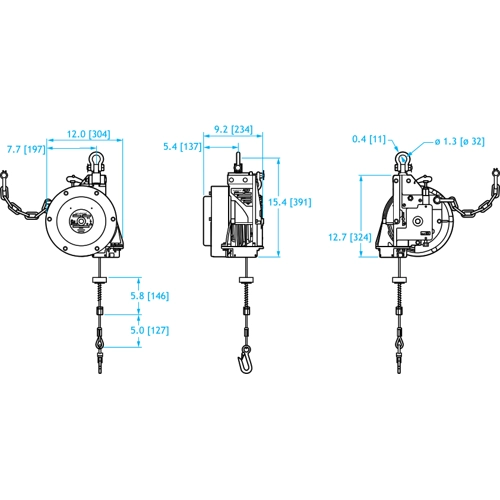 Aero-Motive Schwerer Industrieeinsatz KA Balancer mit Verlängerter Kabelhub, Obere/untere Bullard-Haken und oberer Schäkel, Traglast 58.0-66.0 kg (130.0-145.0 lb), 2.74 m (9.0') Hub