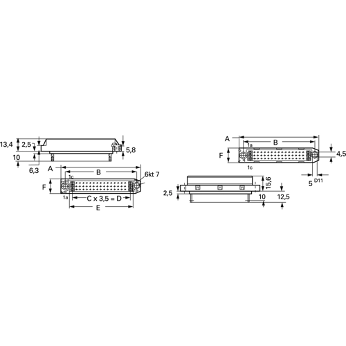 Mit Lötösen für freie Verdrahtung; Isolierkörper: aus Thermoplast, glasfaserverstärkt, Kontakte: vergoldet, Betriebsstrom bei +20 °C: 4,5 A, Betriebsspannung nach VDE 0110 Gr. A: 300 VDC/250 VAC, kleinste Luft- und Kriechstrecke zwischen den Kontakten: 0,8/1,0 mm, Steckzyklen: 1000, Maße: A 47, B 38, C 6,0, D 21, E 27, F 15 mm.