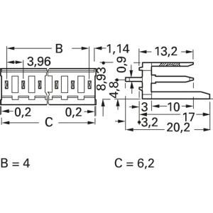 Im Rastermaß 3,96 mm, für Leiterplattenstärke 1,6 mm, mit grünem Gehäuse aus Polycarbonat, selbstverlöschend nach UL 94 V-0, mit verzinnten oder vergoldeten Messingkontakten; Maße: 2polig: B 4,0, C 6,2 mm. 4polig: B 11,9, C 14,2 mm. 6polig: B 19,8, C 22,1 mm. 8polig: B 27,7, C 30 mm. 10polig: B 35,7, C 37,9 mm. 12polig: B 43,6, C 45,9 mm.