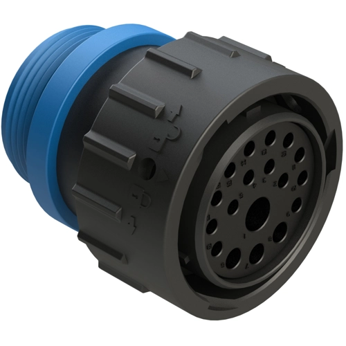 18-poliger Stecker, Buchse, Gehäusegröße 24, Dichtung mit reduziertem Durchmesser (Blau), Adapter mit kleinem Gewinde.