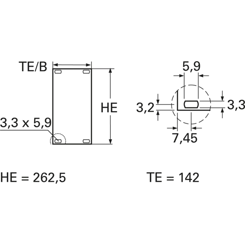Aus 2,5 mm starkem Aluminium, mit eloxierter Frontseite und an der Oberfläche transparent chromatierter Rückseite; Höhe: 3 HE 129,0 mm, 6 HE 262,5 mm.