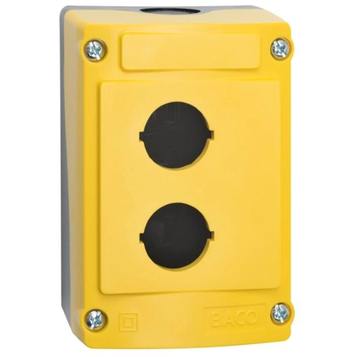 Für 22 mm Befehls- und Meldegeräte, in Kombination mit Kontaktelementen für Gehäuse (Bodenbefestigung, 2 vorgepresste Ausbruchstellen (ISO-1620), mit schwarzem Unterteil; Schutzart: IP 66, Abmessungen: 107 x 74 x 47,9 mm, gelb, Einbaustellen 2.