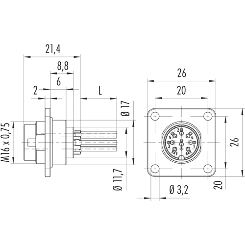 Einbaustecker, M16, 6-polig, Litzenanschluss, Schraubverriegelung, gerade, 09 0123 320 06