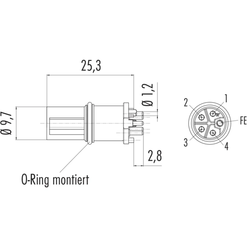 Einbaustecker, M12, 4-polig + FE, THR, Schraubverriegelung, gerade, 09 0641 100 05