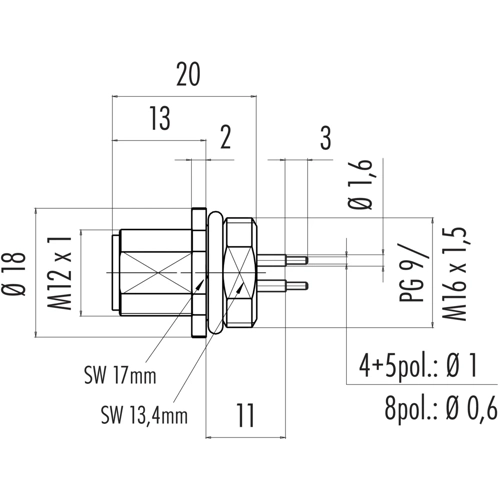M12-A Flanschstecker, Polzahl: 8, ungeschirmt, THT, IP68, UL, M16x1,5.
