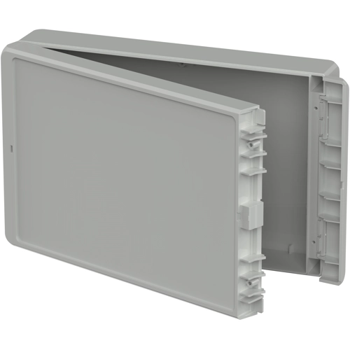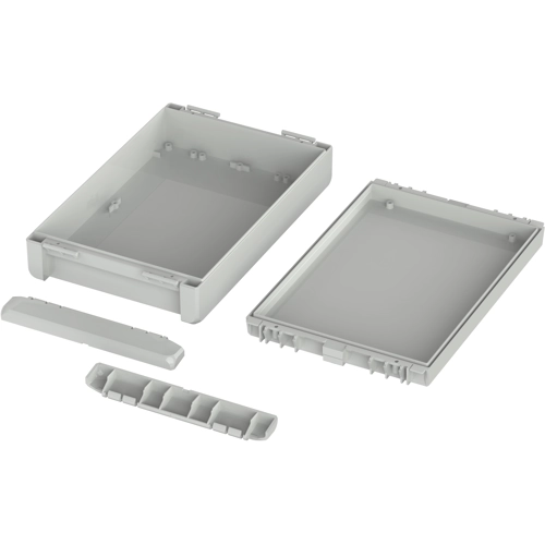 Mit Scharnierverschlüssen und geschäumter Dichtung, Vertiefung für Folientastaturen, Einbauraum für Front- und Leiterplatten, einfache und schnelle Montage ohne Werkzeug; Material: ABS,Schutzart: IP 66/IP 67 DIN 60529, Farbe: lichtgrau.