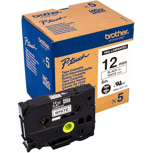Schriftbandkassette, 12 mm, Band weiß, Schrift schwarz, 8 m, HGE-231V5, Packung mit 5 Stück