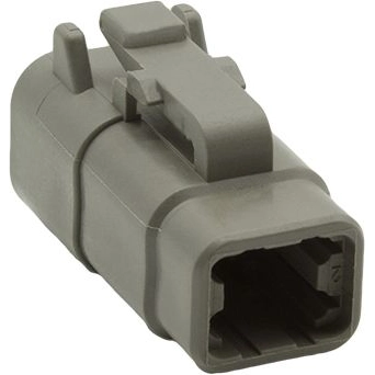 Der rechteckige graue Miniaturstecker mit 4 Kontakten (Stecker) wird mit einer Schutzkappe (PEC) geliefert und entspricht im gesteckten Zustand der Schutzart IP68.