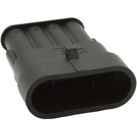 Der 4-polige rechteckige schwarze Stecker für den Automobilbereich mit IP68-Schutzklasse im gesteckten Zustand.