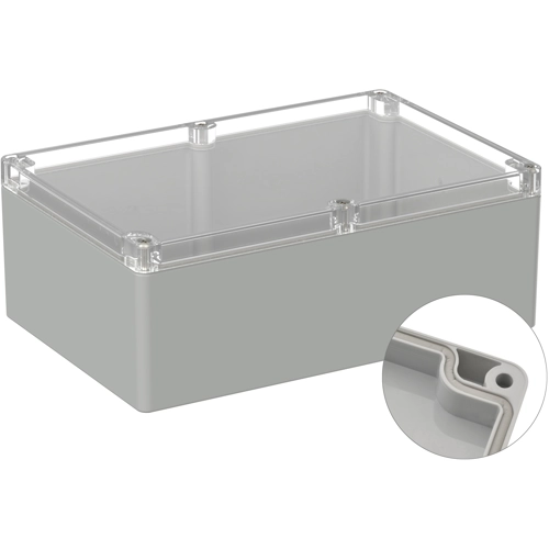 Hochwertiges Industriegehäuse aus Polycarbonat mit transparentem Deckel. Die Gehäuse sind geeignet für den Außenbereich. Werkseitig eingezogene Rundschnurdichtung Verschraubung der Deckelschrauben in hochwertige Gewindebuchsen, Kein Gewindeverschleiß auch bei mehrmaligen. Öffnen Platinen und Montageplatten können über Schraubdome im Unterteil sicher befestigt werden. Die gegen herausfallen gesicherten Deckelschrauben werden in hochwertige Gewindebuchsen eingeschraubt. Das Gehäuse kann mit Hilfe der Schraubkanäle im Unterteil an der Wand montiert werden. Große Bearbeitungsflächen und vielseitige Montagemöglichkeiten für Steckverbinder, Schalter und Tasten.
