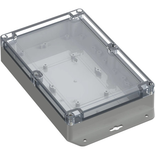 Hochwertiges Industriegehäuse aus Polycarbonat mit transparentem Deckel. Das Gehäuse ist mit direkt angeformten Wandlaschen ausgerüstet. Die gegen Herausfallen gesicherten Deckelschrauben werden in hochwertige Gewindebuchsen eingeschraubt. Leiterkarten können über Schraubdome im Unterteil sicher befestigt werden. Eingeschäumte hochwertige Dichtung (PU) Bearbeitungsflächen und vielseitige Montagemöglichkeiten für Steckverbinder, Schalter und Tasten.