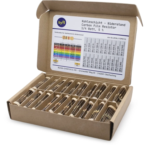 Dieser Satz enthält 400 Stück Kohleschichtwiderstände mit einer Leistung von 1/4 W (0,25 W) und einer Toleranz von 5 %. Je Wert 20 Stück.