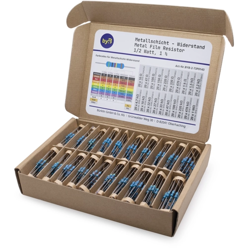 Dieses Set enthält 400 Stück Metallfilmwiderstände mit einer Nennleistung von 1/2W (0,5W) und einer Toleranz von 1%. Je Wert 20 Stück.