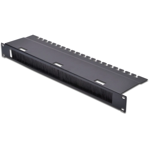 Die Kabeldurchführungspanel werden an den 483 mm (19“)-Profilschienen befestigt. Die Öffnung verfügt über eine Bürstenleiste, welche das Beschädigen von durchgeführten Rangierkabeln verhindert. Eine Rückseitige Ablagefläche mit Kabelfixierungsbügeln für bis zu 24 Kabel rundet das Design der Panel ab und ermöglicht somit ein optimales Kabelmanagement in Ihrem 483 mm (19“) Netzwerk- oder Serverschrank.