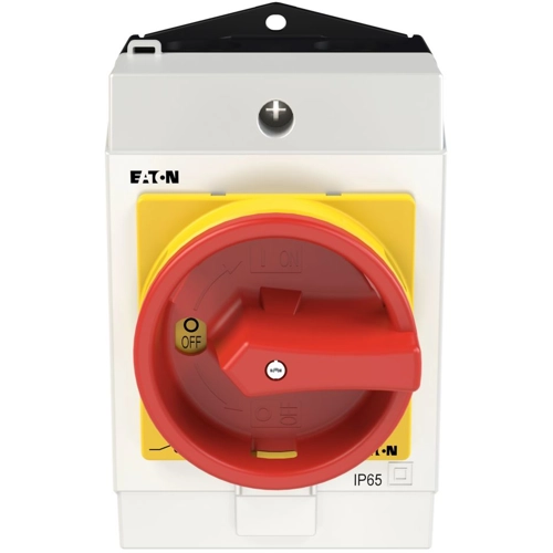 Der Hauptschalter mit einer Nennleistung von 20 A ist für die Aufputzmontage vorgesehen und verfügt über eine zweipolige Einheit mit drei Polen. Er verfügt über eine Notabschaltfunktion und ist mit einem roten Drehgriff und einem gelben Sicherungsring ausgestattet.