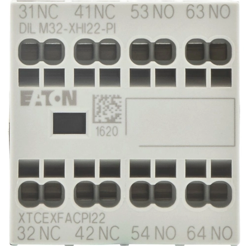 Das Hilfskontaktmodul ist vierpolig enthält zwei Schließer und zwei Öffner. Es ist für die Frontmontage vorgesehen und verfügt über Push-In-Klemmen für die Anschlüsse.
