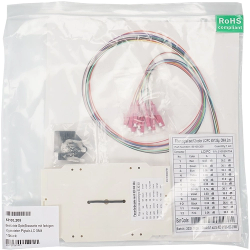Bestückte Spleißkassette mit Pigtails in den Kategorien OM3, OM4, OM5, OS2 und OS2/APC. Die Pigtails sind abgesetzt, in die Spleißkassette eingelegt und haben eine Länge von 80cm außerhalb der Kassette, um die Kabelführung in der Spleißbox entsprechend einfach umsetzen zu können. Die verwendeten Pigtails sind nach VDE-0888 Farbcode mit einem durchgefärbten Coating und 12-farbigem Mantel. Die Messprotokolle der einzelnen Fasern liegt der Verpackungseinheit bei. Zusätzlich ist in der Spleißkassette der Crimpspleißhalter (12 Spleiße) vormontiert, die Schrumpfspleißschutzhalter (2x à 6 Spleiße) liegt der Verpackungseinheit bei.