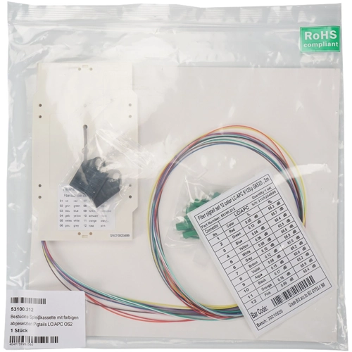 Bestückte Spleißkassette mit Pigtails in den Kategorien OM3, OM4, OM5, OS2 und OS2/APC. Die Pigtails sind abgesetzt, in die Spleißkassette eingelegt und haben eine Länge von 80cm außerhalb der Kassette, um die Kabelführung in der Spleißbox entsprechend einfach umsetzen zu können. Die verwendeten Pigtails sind nach VDE-0888 Farbcode mit einem durchgefärbten Coating und 12-farbigem Mantel. Die Messprotokolle der einzelnen Fasern liegt der Verpackungseinheit bei. Zusätzlich ist in der Spleißkassette der Crimpspleißhalter (12 Spleiße) vormontiert, die Schrumpfspleißschutzhalter (2x à 6 Spleiße) liegt der Verpackungseinheit bei.