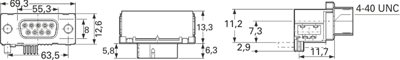 Abgewinkelt und mit einer Einbauhöhe von 3,6 (Eurostyle) oder 7,3 mm (Standard), für vollautomatische Verarbeitung durch eine integrierte Saugfläche, Design gemäß DIN 41652 und CECC 75301-802; Isolierkörper: Hochtemperatur Polymer, Kontakte: Cu-Legierung, Oberflächen-Kontakt Steck-/Anschlussbereich: vergoldet/Sn, Luft- und Kriechstrecke: 1,2 mm, Frontblech: St/Sn, Metallwinkel: Cu-Legierung/Sn, Maße: 9pol./A 30,8, B 16,8, C 25 mm, 15pol./A 39,1, B 25,1, C 33,3 mm, 25pol./A 53, B 38,9, C 47 mm, 37pol./A 69,3, B 55,3, C 63,5 mm.