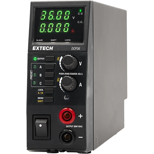 Das DCP36-Netzteil von Extech hat eine konstante Leistungstopologie von 80 W und verfügt über einen autoranging Spannungs- und Stromausgang. Dieses kompakte und leichte Gerät ist leicht zu transportieren und eignet sich ideal für enge Werkbänke mit begrenztem Platzangebot. Es verfügt über 4-stellige LED-Anzeigen, 3 programmierbare Voreinstellungen, vordere/hintere Ausgangsanschlüsse und eine Fernabfrage für eine genaue angelegte Spannung am Lastpunkt.