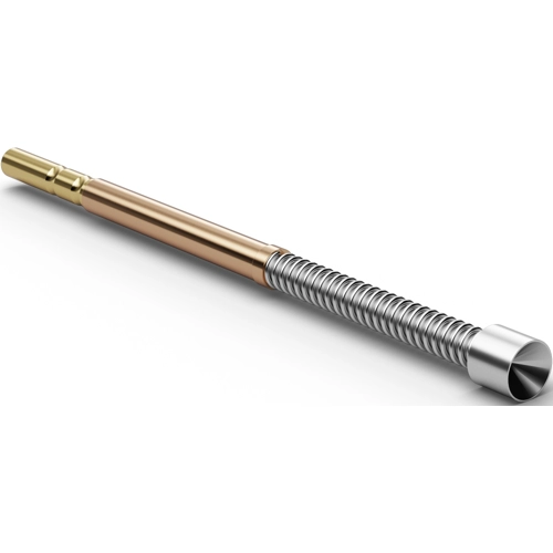 Der Stift hat einen durchgehenden Kolben und damit einen sehr geringen Durchgangswiderstand. Die Anschlusslitze wird direkt eingecrimpt oder eingelötet. Dieser Prüfstift ist besonders gut für den Nieder Ohm-Bereich und für Hochstromanwendungen geeignet.