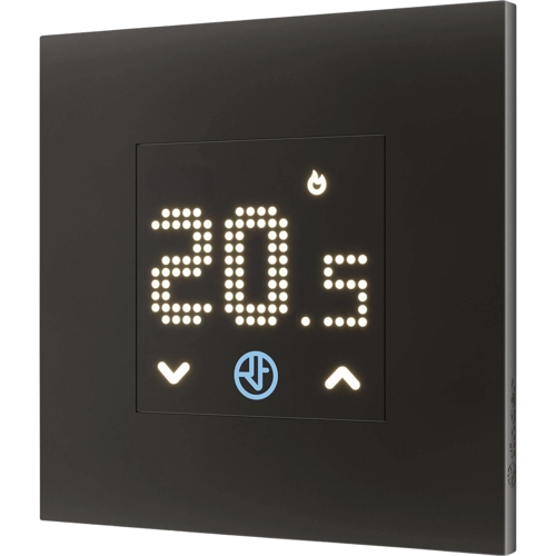Thermostat für Unterputzdosenmontage in flacher Bauweise. Mit Sommer- und Winterfunktion, Display-Sperre über PIN-Code, Display mit einstellbarer Helligkeitsregelung, Tag/Nachtfunktion.