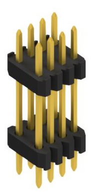 Sandwich Stiftleiste, zweireihig, 0,4 mm, zur Verbindung übereinanderliegender Leiterplatten, Raster 1,27 x 1,27 mm.