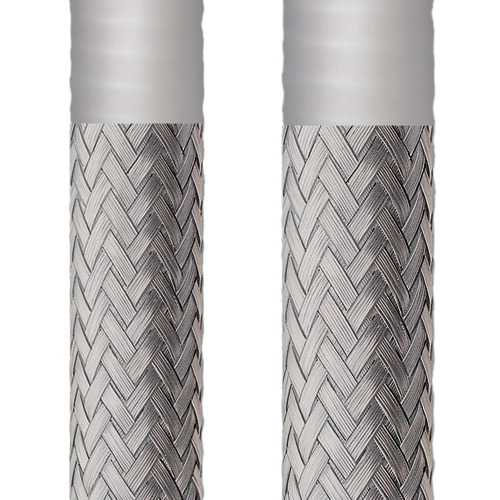 Drahtgeflecht mit PVC-Trägerschlauch, bestehend aus rund geflochtenen, verzinnten Kupferdrähten mit doppelt gekreuzter Umflechtung in den verschiedenen Flechtwinkeln.
