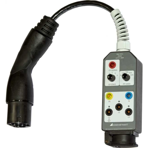 1- und 3-phasiger Prüfadapter mit Stecker Typ 2 zum Prüfen der Wirksamkeit von Schutzmaßnahmen an E-Ladepunkten mit dem Profitest Master, Simulation von fiktiv angeschlossenen Elektrofahrzeugen sowie Simulation der Strombelastbarkeit gemäß IEC 61851-1. Verlängerter CP Prüfstift zum Prüfen von Ladepunkten mit fest montiertem Ladekabel.
