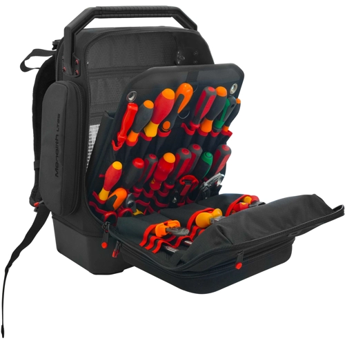 Werkzeugrucksack für den Transport von Werkzeugen, Dokumenten und einem 15"-Notebook. Fronttasche und Seitentaschen für Werkzeuge und Zubehör.