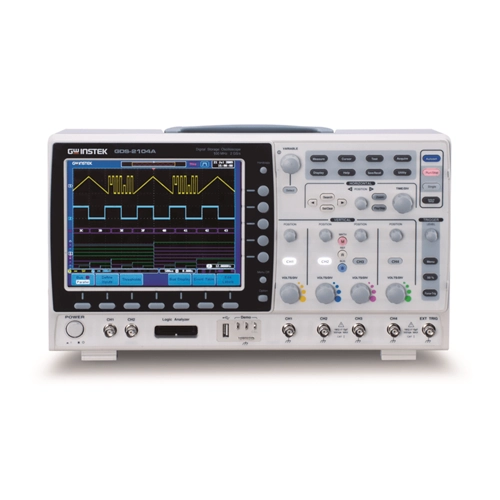 GW Instek GDS-2304A 8" LCD-Farbdisplay Visuelle Persistenz Digitales Speicheroszilloskop mit USB-Anschluss, 300MHz Bandbreite, 4-Kanal, 1,17ns Anstiegszeit. 2GSa/s Echtzeit-Abtastrate und bis zu 300MHz Bandbreite. Die digitalen Speicheroszilloskope der Serie GDS-2000A bieten 2- und 4-Kanal-Konfigurationen und eine große Auswahl an Bandbreiten, darunter 300MHz, 200MHz, 100MHz und 70MHz. Jedes Modell bietet eine maximale Echtzeit-Abtastrate von 2GSa/s und eine Hochgeschwindigkeits-Äquivalentzeit-Abtastrate von 100GSa/s. Ausgestattet mit einem hochauflösenden 8-Zoll-TFT-LCD-Display mit 800 x 600 Pixeln, einem vertikalen Bereich von 1mV/div bis 10V/div und einer Zeitbasis von 1ns/div bis 100s/div ist die GDS-2000A-Serie in der Lage, Wellenformen komplizierter und undurchsichtiger Signale originalgetreu darzustellen... 2Mega-Punkt-Aufzeichnungslänge, Wellenformsuche und segmentierte Speicherfunktionen. Die GDS-2000A-Serie bietet standardmäßig eine Aufzeichnungslänge von 2 Megapunkten sowie Funktionen für die Wellenformsuche und den segmentierten Speicher. Die interessanten Ereignisse können erfasst und im segmentierten Speicher, der in 2048 Abschnitte unterteilt werden kann, zur Beobachtung gespeichert werden, während die irrelevanten Wellenformen ignoriert werden können. Folglich kann die Gesamteffizienz der Speichernutzung verbessert werden. Im Wellenform-Suchmodus kann das GDS-2000A nach Auslösung des Eingangssignals die Wellenformabschnitte suchen und markieren, die den benutzerdefinierten Suchbedingungen und dem Schwellenwert im gesamten Speicher entsprechen. Mit dem Zoom-Fenster und der Play/Pause-Taste zum Scrollen durch die gesamte angezeigte Wellenform kann der Benutzer schnell und effizient durch alle Wellenformen navigieren.