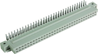 Federleiste, Wellenlötanschluss, Bemessungsstrom: 2 A, Kontakte: 64, gewinkelt, Kupferlegierung, Edelmetall über Ni steckseitig, Sn über Ni anschlussseitig, Anforderungsstufe: 2, nach IEC 60603-2, Kodierung: Kodierung mit Kontaktverlust, Seiten-Kodierung, Leiterplattenbefestigung: mit Flansch, Thermoplastischer Formstoff, glasfaserverstärkt, RAL 7032 (kieselgrau)