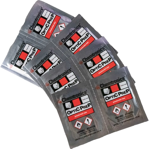 Die vorgetränkten Optic-Prep-Tücher sind hochwertige, vorbefeuchtete Linsentücher für die Reinigung optischer Oberflächen. Diese hochwirksamen Reinigungstücher sind ideal zum Reinigen und Polieren von optischen Oberflächen, Linsen, fotografischen Geräten, CRT- und LCD-Bildschirmen und Instrumenten. Optic Prep ist sicher für die Verwendung auf Glasfaseranschlüssen. Die vorgesättigten Optic Prep-Tücher enthalten ultrareinen Isopropylalkohol (65% IPA / 35% reines Wasser) auf einem ultraweichen, linsengerechten Tuch.