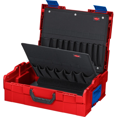 Robuste Box aus schlag- und stoßfestem ABS-Kunststoff. Spritzwassergeschützt. Mehrere Boxen können zuverläßig miteinander verbunden werden. Flexible Innenaufteilung. Tragegriff kann platzsparend in einer Vertiefung im Deckel versenkt werden. Ergonomisch geformte Griffe und zusätzliche seitliche Griffschalen für flexibles und komfortables Handling. Mit zweiteiliger Werkzeugkarte aus strapazierfähigem Polyester-Gewebe. Werkzeugkarten sind über Klett miteinander verbunden. Deckelteil mit 10 Taschen und 10 elastischen Schlaufen. Bodenteil oben mit 7 Taschen und Lasche zum Aufhängen der Werkzeugkarte- dient auch zum Anheben und Aufstellen der L-BOXX®. Bodenteil unten mit 7 Taschen und 7 elastischen Schlaufen. Belastbarkeit bis 25 kg
