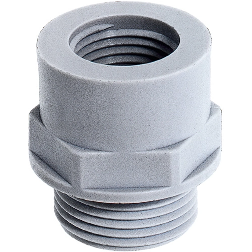 Der 52100333 Adapter aus Polyamid, glasfaserverstärkt, wird verwendet, wenn in vorhandenen PG-Gewindebohrungen im Gehäuse Verschraubungen mit metrischem Anschlussgewinde eingesetzt werden müssen.