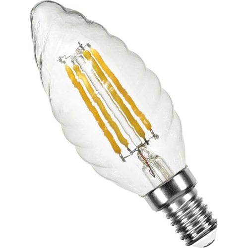 Diese LED Filament Kerzenlampe kombiniert die Eleganz gedrehten Glases mit der Effizienz moderner LED-Technologie. Mit 4W Leistung, was einer herkömmlichen 40W Glühbirne entspricht, und 470 Lumen warmweißem Licht bei 2700K, bietet sie sowohl stilvolle Beleuchtung als auch hohe Energieeffizienz. Das klare, gedrehte Glas verleiht dieser Lampe eine besondere Ästhetik und sorgt dafür, dass das warmweiße Licht kunstvoll reflektiert wird. Diese Lampe eignet sich perfekt für dekorative Leuchten, in denen sie eine elegante und einladende Atmosphäre schafft, während die geraden Filamentstäbe eine moderne Lichtquelle darstellen, die mit klassischen Designelementen harmoniert.