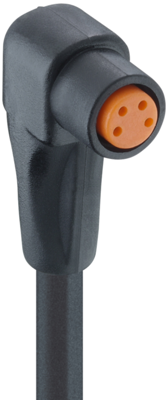 Sensor-Aktor-Leitung mit umspritztem Steckverbinder, eine Seite mit abgewinkelter M8-Buchse, A-kodiert, 4-polig, mit Schnappverschluss, andere Seite mit offenen Enden, 4 x 0,34 mm² (AWG 22), Kabelmaterial: PVC, schwarz, 10 m lang, nach UL-Style 2464. Bemessungsspannung: 50 VAC/60 VDC (bei Verschmutzungsgrad 3), Bemessungsstrom: 4,0 A (bei 40 °C), Bemessungsstoßspannung: 1,5 kV, Schutzart: IP65, Temperaturbereich: -25 °C bis 80 °C.