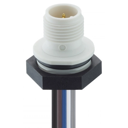 M12-Einbaustecker, A-kodiert, IP67, für Frontmontage, Verschraubung M16, mit Mutter und Litzen, mit Kunststoffgehäuse, weiß.