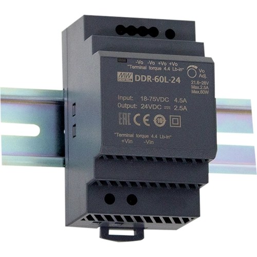 Der DDR-60G-12 ist ein 60-W-DC/DC-Wandler für DIN-Schienen mit folgenden Hauptmerkmalen: einfache Installation auf DIN-Schienen, extrem schmale Bauweise (52,5 mm), extrem breiter Eingangsspannungsbereich von 4:1, großer Betriebstemperaturbereich von -40 bis +85 °C, 4-kV-DC-I/O-Isolation, einstellbare Ausgangsspannung (±10 %) und umfassende Schutzfunktionen. Geeignete Anwendungen sind DC-Buck-/Boost-Regler, die Erhöhung des Isolationsniveaus des Systems und die Kompensation von Spannungsabfällen entlang des Kabels.