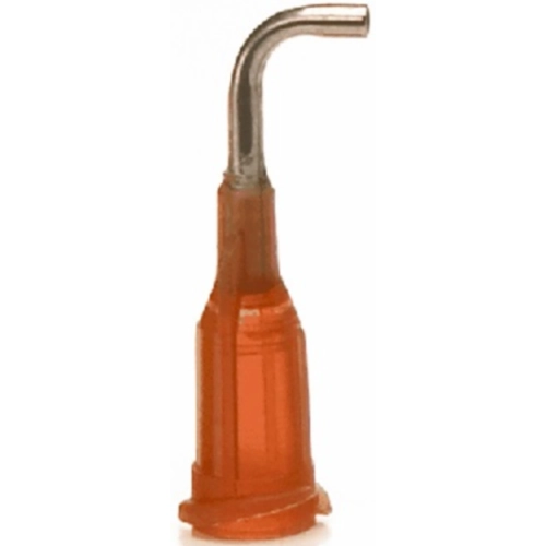 Gebogene Dosiernadel, mit Luer-Lock-Anschluss. Die Edelstahlkanüle ist präzise um 45° oder 90° Grad gebogen und eignet sich ideal für die Dosierung in schwer zugänglichen Bereichen. Erhältlich in Verpackungseinheiten von 50 Stück.
