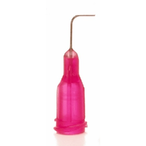 Gebogene Dosiernadel, mit Luer-Lock-Anschluss. Die Edelstahlkanüle ist präzise um 45° oder 90° Grad gebogen und eignet sich ideal für die Dosierung in schwer zugänglichen Bereichen. Erhältlich in Verpackungseinheiten von 50 Stück.