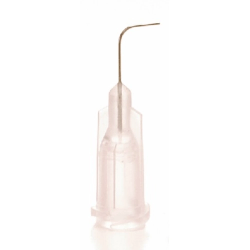 Gebogene Dosiernadel, mit Luer-Lock-Anschluss. Die Edelstahlkanüle ist präzise um 45° oder 90° Grad gebogen und eignet sich ideal für die Dosierung in schwer zugänglichen Bereichen. Erhältlich in Verpackungseinheiten von 50 Stück.