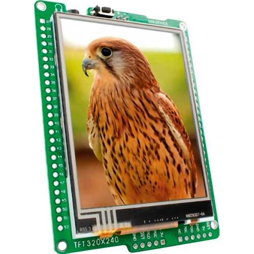 Display size: 2.8",Resolution: 320x240px,MCU: PIC18F87J50,MCU speed: 12 MIPS, 48MHz, 0.25 MIPS/MHz,MCU Memory: 128KB of Flash, 3904 bytes of RAM,Graphic controller: ILI9341,Touch Screen: Resistive,Storage: 8 Mbit Serial Flash, microSD card slot,Peripherals include: USB connector, Accelerometer, Battery Charger,Integration: Mounting holes,Power Supply: 5V (via USB),Applications: Best used as a development board but also as a final product. Use cases include industrial, medical, automotive and other dashboards and equipment.,Programming: Preprogrammed with fast USB HID bootloader. Also features mikroProg for PIC, dsPIC and PIC32 connector.,Expandability: Two 1x26 headers, mikromedia standard pinout,Architecture: PIC (8-bit),Displays: TFT full-color,Sound and Audio: VS1053 MPEG audio decoder
