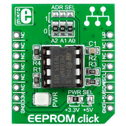 Interface: I2C,Power Supply: 3.3V or 5V,On-board modules: 24C08WP - a highly reliable, high performance CMOS technology,Applications: EEPROM click is an excellent choice for storing initialization and configuration data of your device,Key Features: Three SMD jumpers allow hardware setting of EEPROM address in I2C bus,Key Benefits: Provided DIP socket makes EEPROM easily repleacable,Compatibility: mikroBUS,Product Type: EEPROM,Click board size: S (28.6 x 25.4 mm)