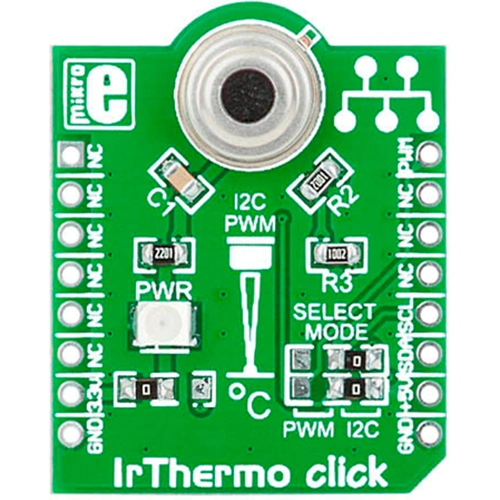 Interface: I2C or PWM,Power Supply: 3.3V,On-board modules: MLX90614ESF-BAA single zone Infrared Thermometer,Applications: Board is ideal for automotive, industrial temperature control, movement detection, air conditioning control and more,Key Features: 17-bit ADC powerful DSP unit and 10-bit PWM,Key Benefits: It is configured to measure temperature in range of -40 to 85 °C with an output resolution of 0.14 °C,Compatibility: mikroBUS,Product Type: Temperature / Humidity,Click board size: S (28.6 x 25.4 mm)