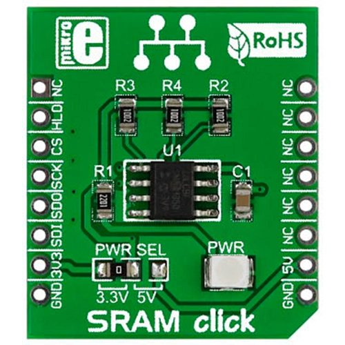 Interface: SPI,Power Supply: 3.3V or 5V,On-board modules: 23LC1024 chip,Applications: Additional 1 MBit SRAM storage for your designs,Key Features: 1 MBit of SRAM memory, 8-bit registers, 32-byte pages,Key Benefits: Unlimited read/write cycles,Compatibility: mikroBUS,Product Type: RAM,Click board size: S (28.6 x 25.4 mm)