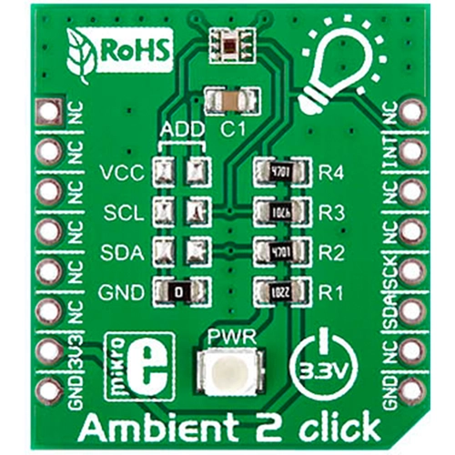 Interface: I2C,Power Supply: 3.3V,On-board modules: OPT3001 Ambient Light sensor,Applications: Display panel backlighting, street light control, security lighting and so on,Key Features: 0.01 lux to 83k lux range, 23-bit resolution,Key Benefits: Approximates light response of human eye,Compatibility: mikroBUS,Product Type: Optical,Click board size: S (28.6 x 25.4 mm)