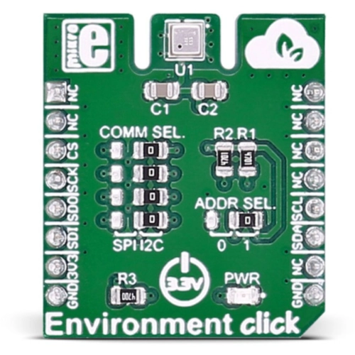 Environment click misst Temperatur, relative Feuchtigkeit, Druck und VOC (Volatile Organic Compounds Gas). Der Click trägt den Umweltsensor BME680 von Bosch. Environment click ist für den Betrieb mit einer 3,3V-Stromversorgung ausgelegt. Er kommuniziert mit dem Ziel-Mikrocontroller über eine SPI- oder I2C-Schnittstelle.